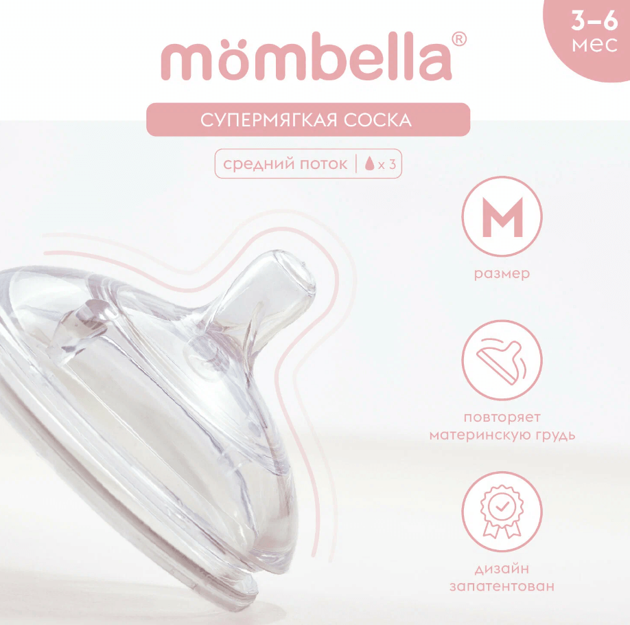 2. Всё сделано из мягкого силикона – в этом безопасном материале и в форме соски и заключается секрет успеха. 3 Разные соски для разного возраста: S и M для ребят 0–2 и 3–5 мес., L и XL для детей 6–8 и 9+ мес. соответственно. Mombella – помощник для родителей, безупречный дизайн и качество материалов. И всё это в одной бутылочке!