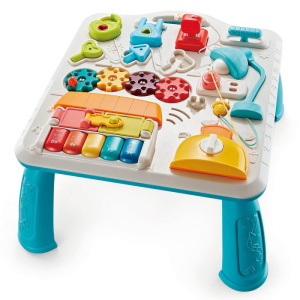 Различные функциональные кнопки на столике научат ребенка распознавать цвета, звуки, ноты. Игрушка развивает моторику рук, память, координацию движений. Игровую поверхность стола (при снятых ножках), можно повесить на горизонтальную поверхность и играть (хомуты в комплекте)