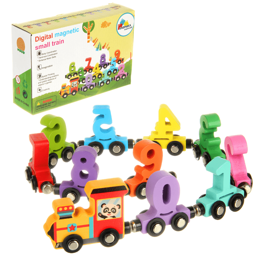 Деревянная игрушка поезд в яркой расцветке и милом дизайне. Качественная обработка деталей без сколов и зазубрин, округлые формы. Игрушка изготовлена из экологически чистого и безопасного материала, дерева, деревянный поезд станет замечательным подарком для детей на Новый год и День рождения. В наборе локомотив и 10 вагончиков в виде цифр. Вагоны с локомотивом можно присоединить друг к другу с помощью магнитов. Локомотив и все вагоны катаются вперед и назад. Изучаем цифры, учимся считать. 11 предметов. Игрушка поезд изготовлена из дерева, есть элементы металла. Размеры локомотива 7х1,5х6 см. Размеры вагона в виде цифры один 6х1,5х6 см. Размеры упаковки 20х5х13 см.