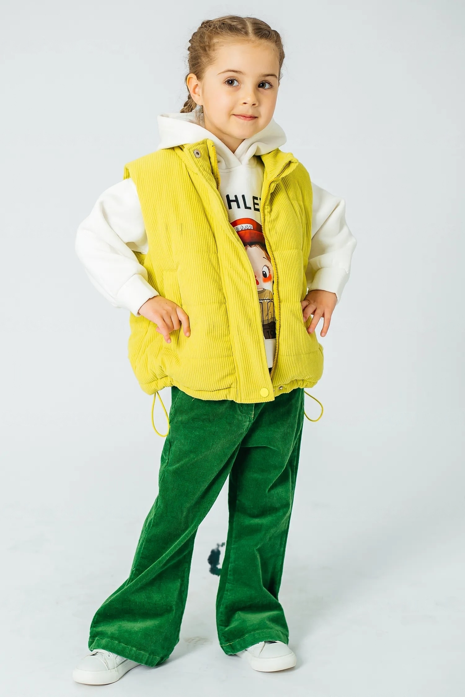 Брюки для девочки сшиты из хлопка с небольшим добавлением спандекса. У ткани мягкая велюровая фактура. У брюк традиционный джинсовый покрой с пятью карманами. Штанины средней ширины, расклешенные от колена. Брюки застегиваются на пуговицу и молнию, на поясе шлевки под ремень. Это универсальная модель, которую можно купить на каждый день и носить практически с любым верхом куда угодно.