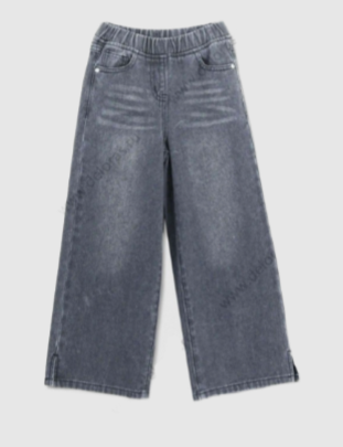 Джинсы для девочки сшиты из хлопковой джинсовой ткани средней плотности. Это кюлоты свободного покроя с широкими штанинами. Посадка высокая, пояс на резинке. Предусмотрены классические джинсовые пять карманов. Внизу штанин по бокам есть небольшие разрезы. Также спереди в области бедер оригинальный выбеленный рисунок в полоску. Купить эти модные джинсы можно на каждый день. Они хорошо сочетаются практически с любым верхом и подходят для любого повода.