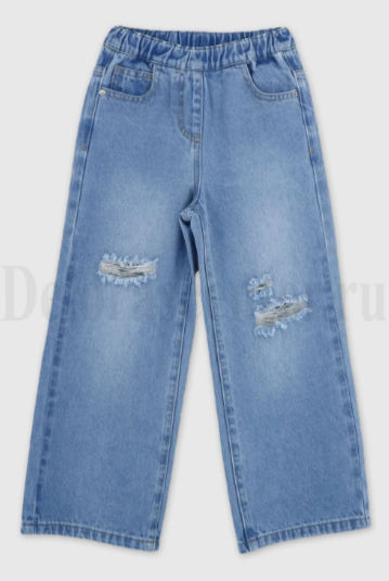 Джинсы для девочки сшиты из плотной смесовой ткани, содержащей хлопок и вискозу. Это брюки свободного покроя с широкими прямыми штанинами. Посадка высокая, пояс на комфортной резинке. Предусмотрены классические пять карманов. Спереди и сзади основная часть штанин слегка выбеленная. Их украшают специально созданные разрывы с бахромой. Такие универсальные детские джинсы можно купить на каждый день и носить с топами, футболками, свитшотами куда угодно.
