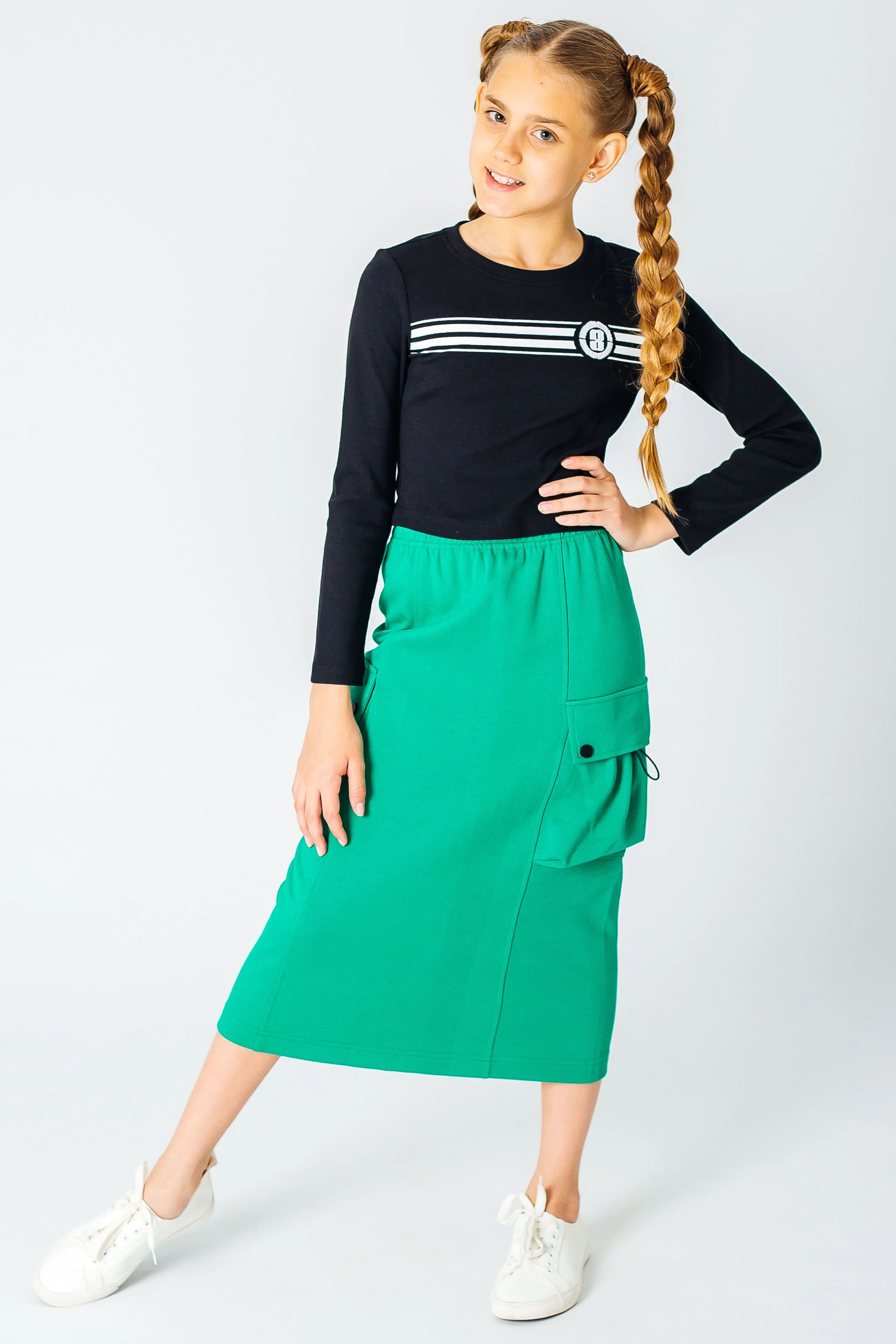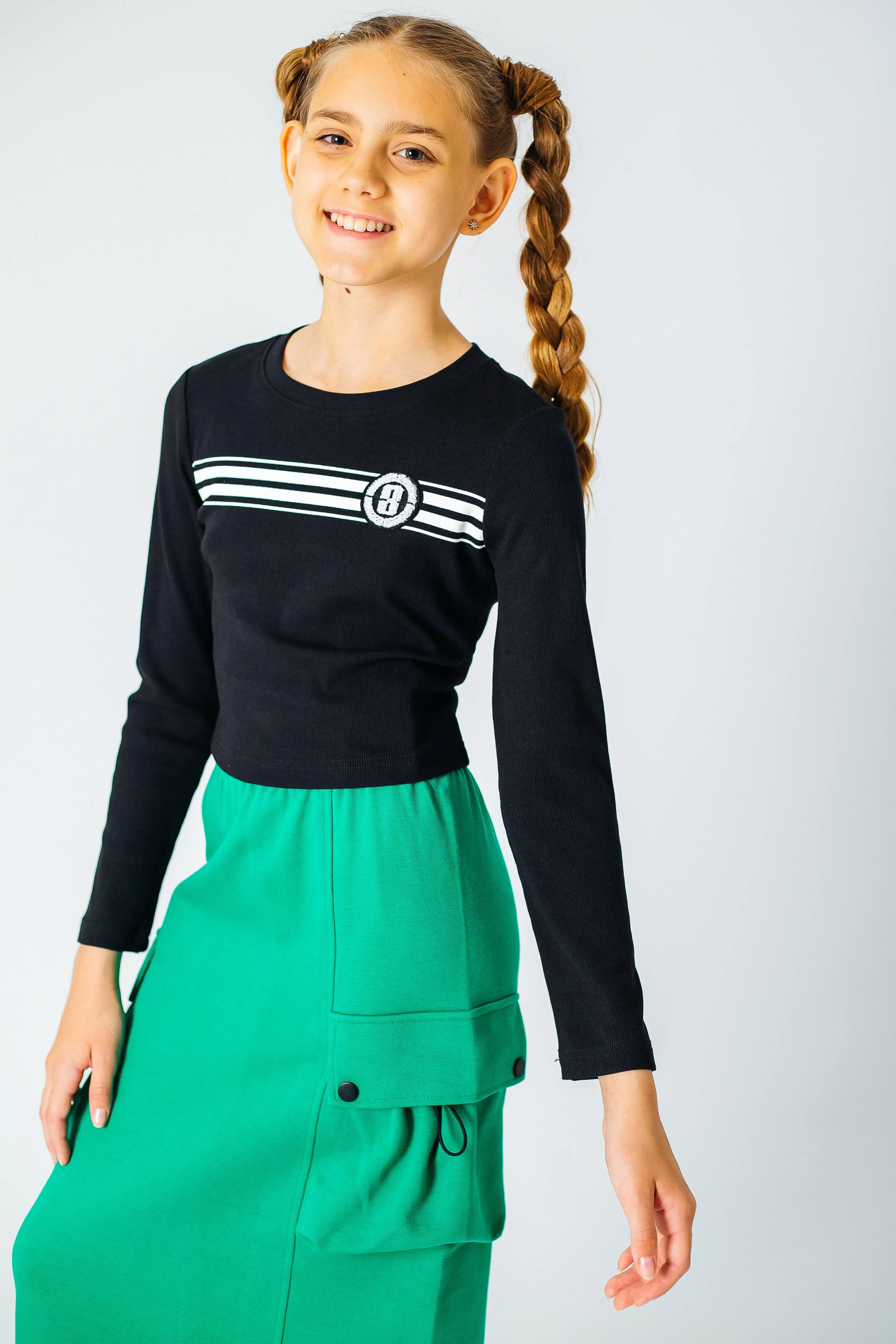 Укороченный лонгслив для девочки подростка сшит из плотного смесового трикотажа с содержанием хлопка и вискозы. Материал мягкий, приятный к телу и комфортный при носке. У кофты прилегающий силуэт, рукава длинные, прямые, без манжет. Вырез горловины круглый, оформлен трикотажной резинкой в тон. На груди принт с полосками и фактурной круглой розеткой с цифрой. Этот симпатичный лонгслив можно купить на каждый день и носить с джинсами или брюками в стиле casual.