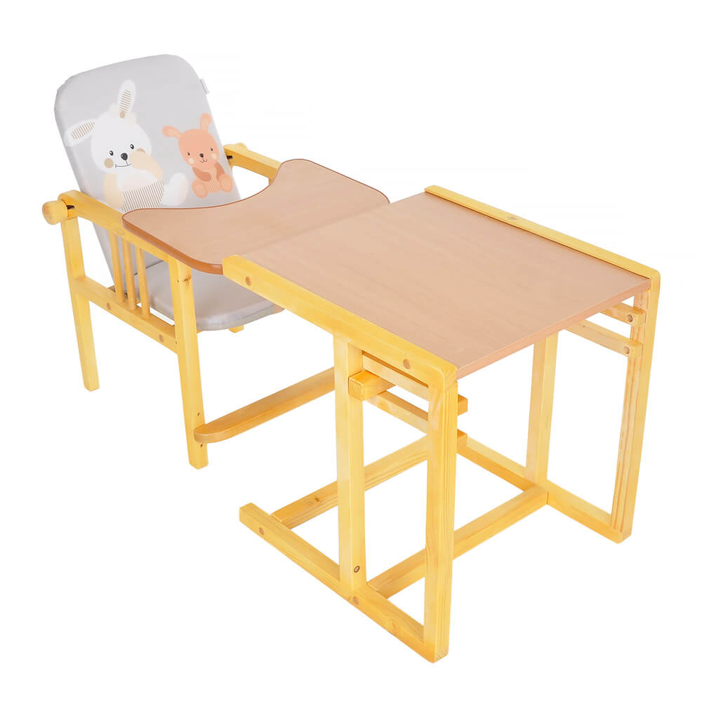 Надежный, крепкий и устойчивый каркас изготовлен из массива сосны и березы, покрыт несколькими слоями нетоксичного лака. Чтобы ребенок не сползал из кресла оно оснащено перемычкой между сиденьем и столешницей. Чехол сидения выполнен из моющегося материала.