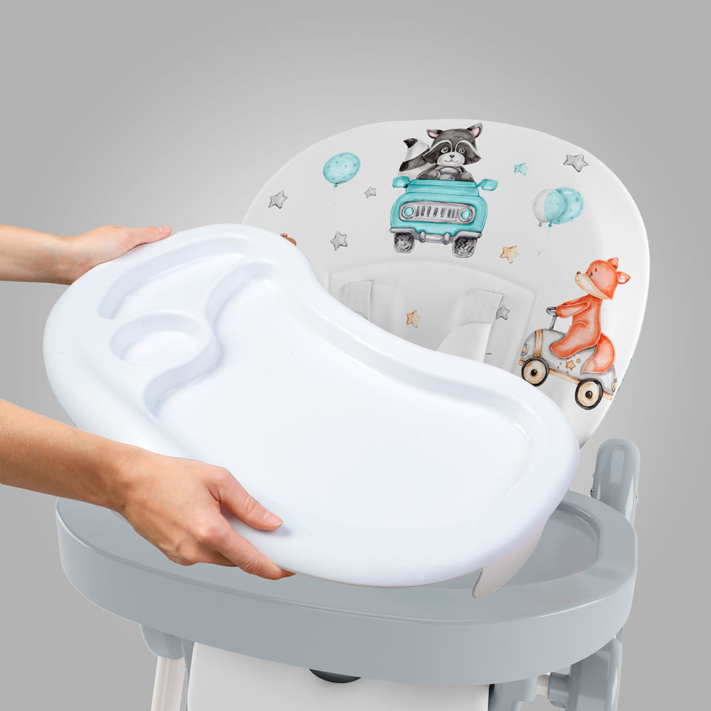У него просторное сиденье с мягкой подкладкой, а также огромный легко моющийся пластиковый поднос.