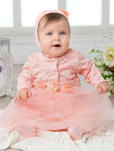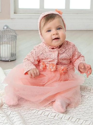 Восхитительный комплект из трех предметов чепчика, комбинезона и нарядного платья станет отличным подарком на первое торжество малышки и украшением семейного праздника. Обратите внимание на волшебные детали и изысканные элементы ручной работы, которые украшают чепчик и верх платья. Изящное кружево идеально сочетается с пышным, словно летнее облачко, платьем. Окружающие оценят прелестные цветы, обрамляющие поясок платьица. У комплекта очень мягкая подкладка из чистого хлопка.