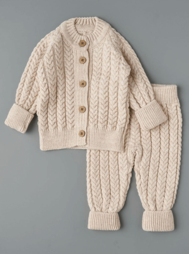 Стильный детский вязаный костюм с брюками и кофточкой без капюшона.Главный критерий одежды для малышей - комфорт. Костюмчик выполнен из пряжи, в составе которой хлопок и шерсть. В холодную погоду в нем тепло и уютно, а при более высоких температурах малышу не будет жарко, благодаря натуральным нитям.