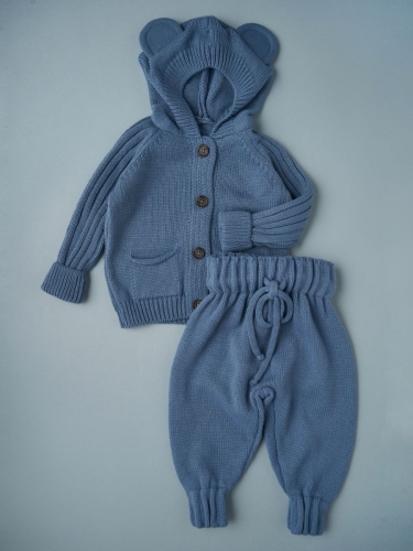 Вязаный костюм мишки. В комплект входят брючки и кофта с капюшоном с ушками. Набор из брюк и кофты можно носить как верхнюю одежду теплой весной и осенью, зимой - надевать под куртку или комбинезон.