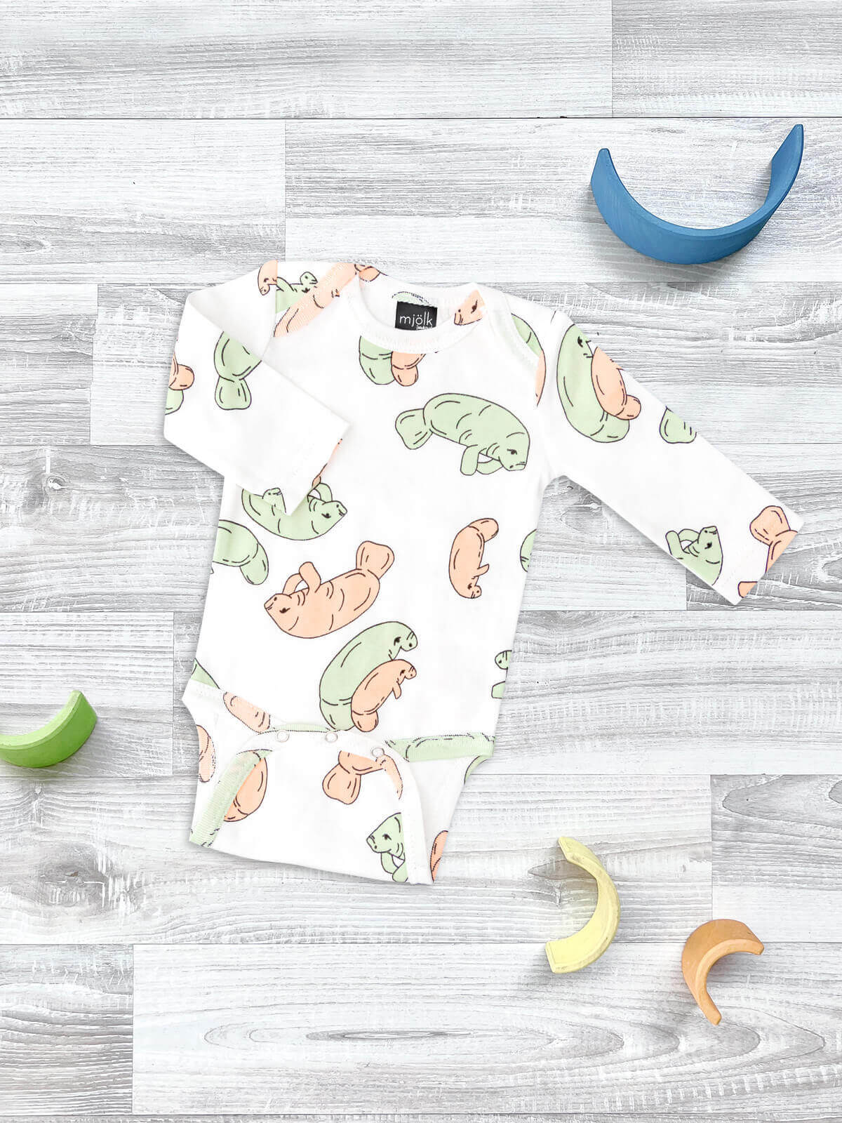 Боди Mjölk растягивается по фигуре, ребёнку в нём не жарко, он не потеет. В такой одежде можно играть и спать круглый год, поддевать её под комбинезон или спальный мешок. Материал приятный на ощупь, эластичный, гигроскопичный, "дышит" и не вызывает аллергии. Кнопки расположены значительно выше их привычного месторасположения, что облегчает застёгивание изделия на малыше. В сопутствующих товарах можно подобрать изделия в комплект с таким же принтом: мягкую шапочку с узелком, двусторонний плед, сет пелёнок в тон или яркий комбинезон.