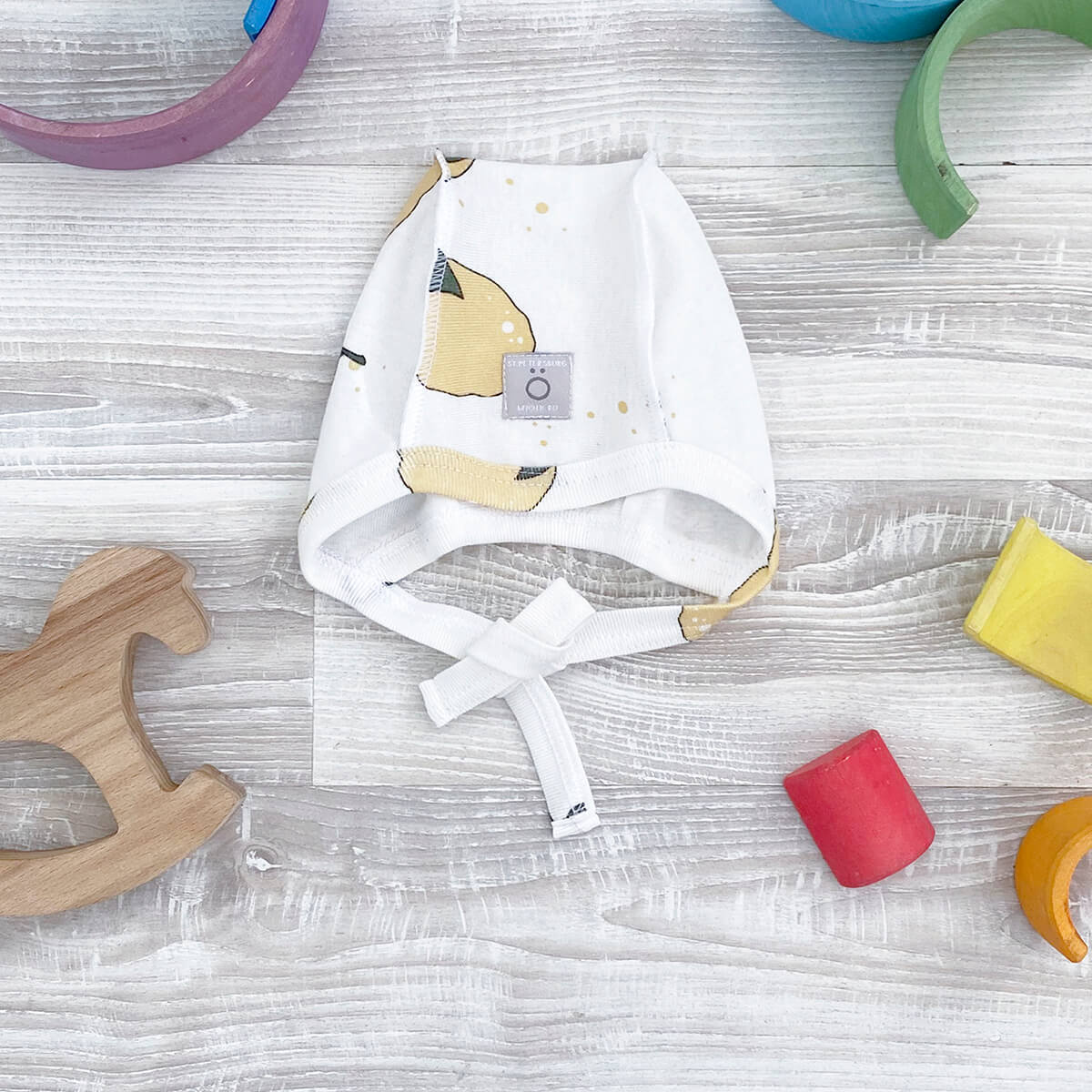 Изделие выполнено швами наружу, модель садится по голове ребёнка, хорошо повторяя её форму и надёжно закрывая ушки, а завязочки мягко удерживают чепчик.