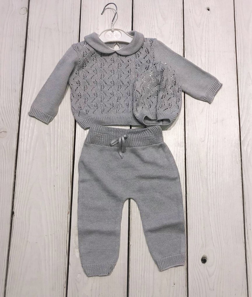Комплект для малыша, в который входит: свитер, шапочка и штаны. Практичный комплект, который подойдёт для повседневной носки, для прогулок в осенне-весенний период. Вашему малышу будет комфортно в такой одежде ведь она выполнена из 100% хлопка. Штанишки на шнурке не будут давить малышу.